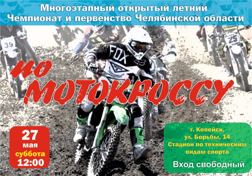 27 мая состоится многоэтапный открытый летний Чемпионат и первенство Челябинской области по мотокроссу. По традиции местом проведения соревнований станет стадион по техническим видам спорта. Начало в 12:00. Приглашаются все желающие.