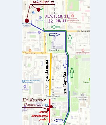 С 18:00 часов 18 июля до окончания работ движение автобусов № 2, 10, 11, 22, 30, 41 будет организовано в объезд ул. Ленина
