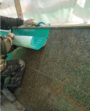 Параллельно подрядчик приступил к облицовке гранитом подиума фасадной части. После окончания монтажа гранита рабочие приступят к укладке и выравниванию пешеходной плитки подиума.