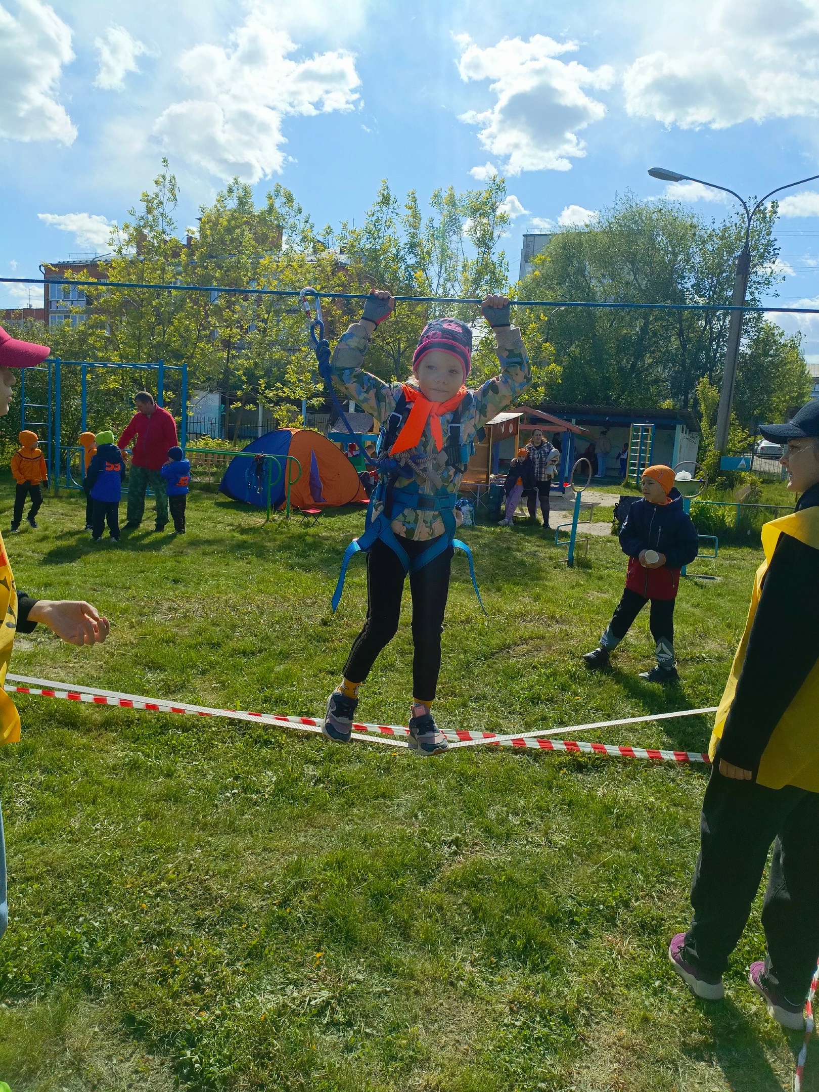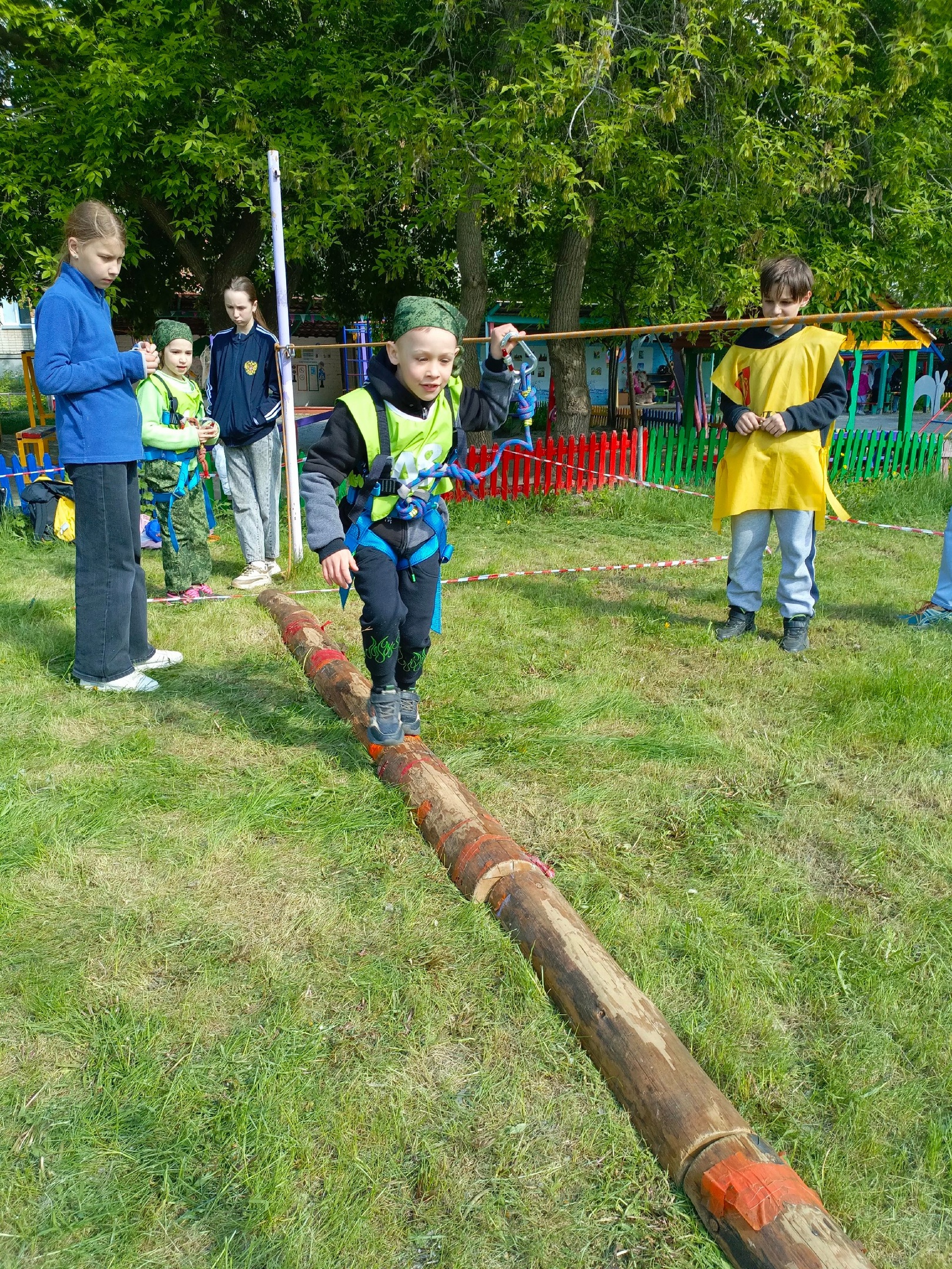 Дистанция состояла из нескольких этапов. Командам нужно было сложить дрова для костра, выложить знак, перепрыгнуть с кочки на кочку через «болото», пройти по бревну, проползти препятствия, преодолеть переправу по параллельным перилам, переправиться при помощи маятника через «овраг» .